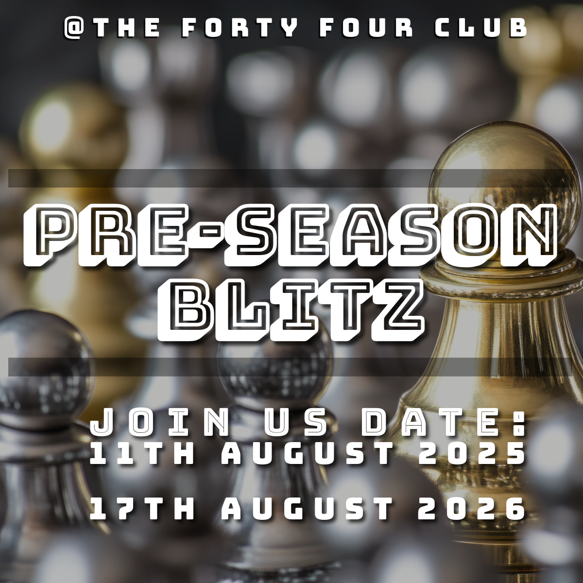 Wolverhampton Chess Club will be hosting a Pre-Season, 10rd, 3+2, Rated Blitz, on Monday 17th August, 2026, 7.30pm at the Forty Four Club, Spring Road, Wolverhampton, WV4 6LQ.